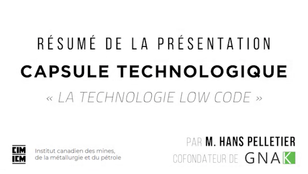 Le 7 décembre 2021, Gnak présentait sa capsule technologique lors de la conférence ICM Amos - Agnico Eagle : Savoir innover. Cette capsule s'intitule « Le low code et la cartographie au service des entreprises ». En voici un extrait: https://www.youtube.com/watch?v=9KUbU_6RjdM Hans Pelletetier, de Gnak, division Application.quebec , spécialiste, formateur et intégrateur AppSheet, logiciel de low code.